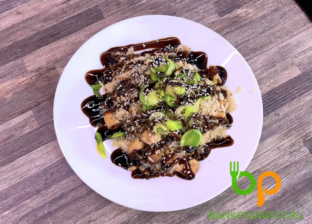 Аппетитный и очень простой рецепт – семга на сковороде с рисом. Завтрак для всей семьи! Готовится всего лишь 30 минут, и съедается также быстро. Попробуйте приготовить – удивите родных новым вкусным рецептом! Пошаговый рецепт: Вначале отварим рис. В глубокую сковородку вливаем оливковое (растительное) масло. Затем высыпаем 400 г сухого риса. Обжариваем на медленном огне до золотистого цвета, после чего наливаем воду. Варим 15-20 минут. Далее берем филе красной рыбы (у меня семга), нарезаем кубиками и отдельно обжариваем на оливковом (растительном) масле. Через 5 минут добавляем соевый соус. Пока готовится рис с семгой, нарезаем лук порей. Затем также обжариваем на сковороде до золотистой корочки. Когда рис приготовится выкладываем к нему кусочки семги, накрываем крышкой и на медленном огне доводим до готовности – не снимаем с огня еще 5 минут. Важный момент: семгу солим, рис не солим. Тогда блюдо получится идеальным. Выкладываем рис с рыбой на тарелку, затем жареный лук порей. Сверху д