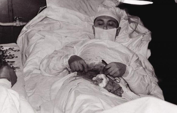 Эта история произошла в 1961 году в Антарктиде. 27-летний доктор Леонид Рогозов участвовал в антарктической экспедиции. 29 апреля Леонид заболел. Как опытный хирург, он определил, что у него острый аппендицит. Но так как он был единственным врачом на станции, а погода была нелетной, он решил делать операцию сам. При помощи метеоролога, подававшего инструменты и водителя, державшего зеркало и направлявшего свет от настольной лампы, врач произвел себе местную анестезию и начал операцию, которая продлилась около двух часов и прерывалась на время, когда он терял сознание. «Я не позволял себе думать ни о чем, кроме дела… Мои бедные ассистенты! В последнюю минуту я посмотрел на них: они стояли в белых халатах и сами были белее белого. Я тоже был испуган. Но затем я взял иглу с новокаином и сделал себе первую инъекцию. Каким-то образом я автоматически переключился в режим оперирования, и с этого момента я не замечал ничего иного». К полуночи операция, длившаяся 1 час 45 минут, была завершен