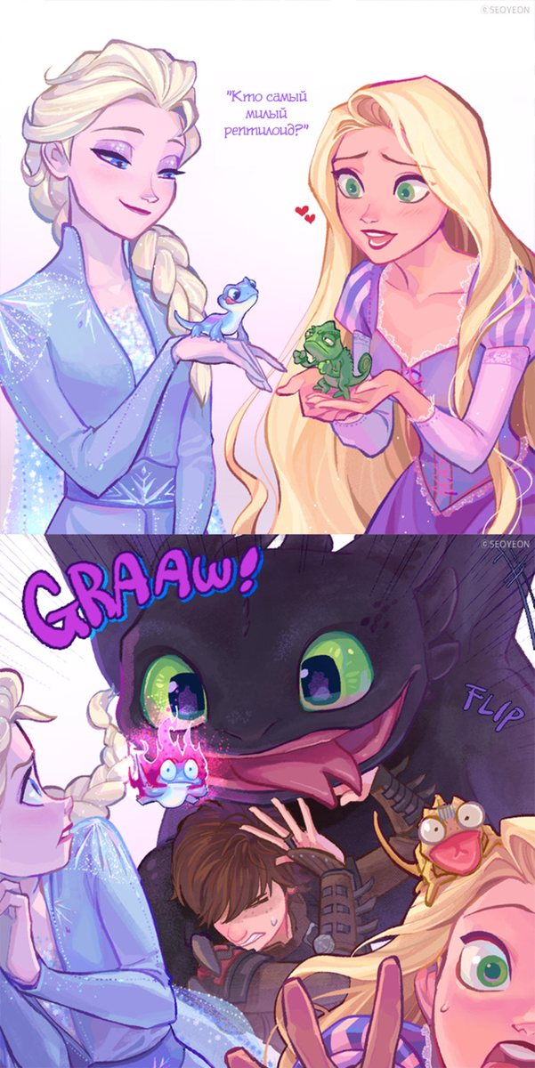 Иногда в комиксах про принцесс будут встречаться персонажи из других проектов Диснея (и не только), на этот раз в комиксе засветился Беззубик и его верный друг Иккинг из мультфильма "Как приручить дракона".