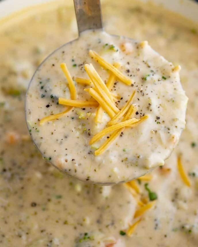 Ингредиенты: Сливочное масло — 5 ст. л. Лук репчатый, крупный, мелко нарезать — ½ шт. Чеснок, измельчить — 2 зубчика Сушёный тимьян — ¼ ч. л. Мука — 50 г Куриный/овощной бульон — 500 мл Мускатный орех — ¼ ч. л. Лавровый лист — 2 шт. Молоко — 625 мл Сливки 10% — 190 мл Брокколи, мелко нарезать — 600 г Морковь, натереть — 2 шт. Чеддер, натереть — 200 г Пармезан, мелко натереть — 3 ст. л. Соль — по вкусу Перец — по вкусу Приготовление: 1. Растопите масло в кастрюле на среднем огне. 2. Добавьте лук и обжаривайте в течение 7 минут, до прозрачности. 3. Добавьте чеснок и тимьян, готовьте ещё 1 минуту. 4. Добавьте муку и продолжайте готовить еще минуту, постоянно помешивая. 5. Влейте бульон, молоко и сливки. Добавьте мускатный орех и лавровый лист. Готовьте, помешивая, пока смесь не начнет пузыриться, около 6–9 минут. 6. Добавьте кусочки брокколи и тертую морковь. Готовьте, пока брокколи не станет нежной, около 6–8 минут. 7. Выключите огонь, снимите кастрюлю с плиты, добавьте чеддер и парме