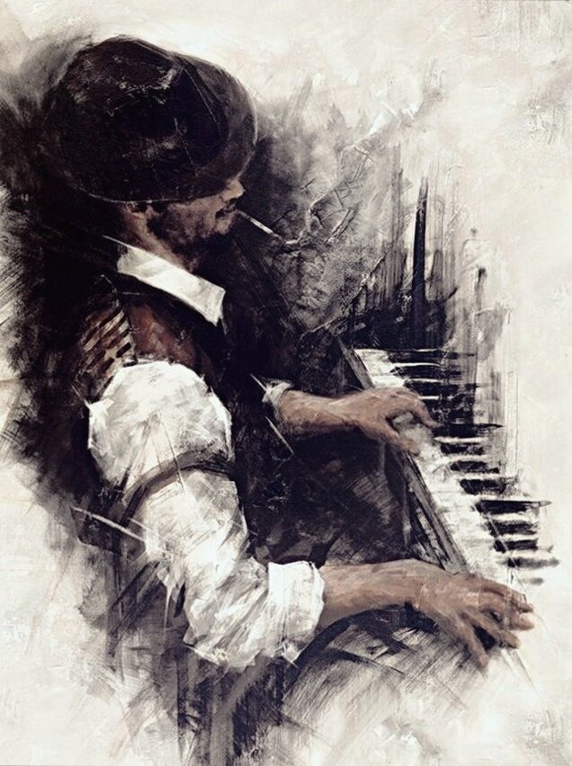 Сегодня фигура музыканта, возникшая из темноты кулис у открытого инструмента, казалась какой-то другой. Хотя одет он был, как и прежде – эдакая небрежная элегантность. Белоснежная сорочка с закатанными рукавами и жилет, свободные брюки, туфли хорошей кожи, на голове – неизменная шляпа с небольшими полями, как бы наброшенная мимоходом слегка набок и надвинутая на глаза. Из-под шляпы выбивались тёмные курчавые волосы. В его облике чувствовалась уверенность мужчины, знающего себе цену.