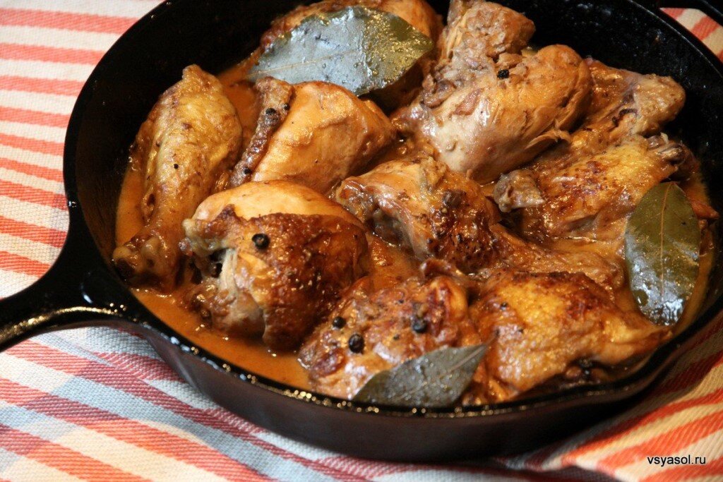 Разогреть сковороду с небольшим количеством растительного масла и выложить замаринованную курицу. Жарить до равномерной золотистости. После этого залить пивом. Довести до кипения на среднем огне. А затем тушить курицу 30 минут, на медленном огне под закрытой крышкой, чтобы пиво еле кипело.