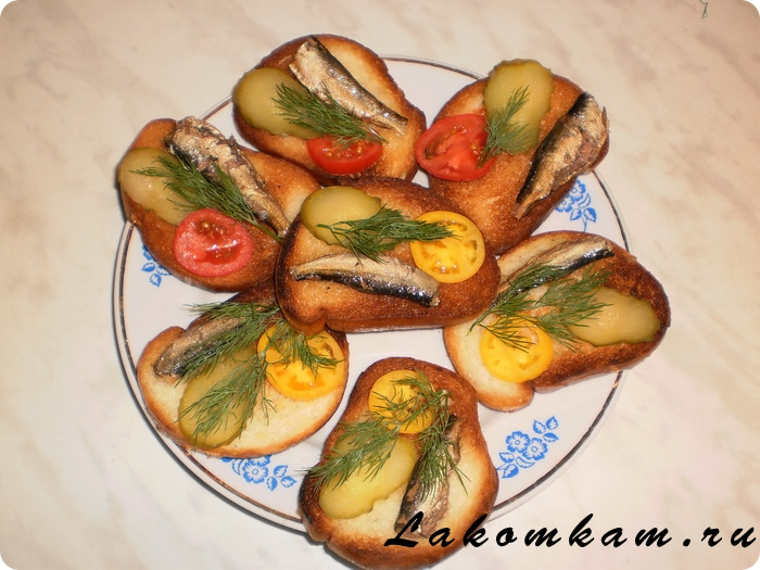 Ингредиенты: нарезной батон — 1 штука; чеснок — 2 зубчика; масло — для жарки; шпроты в масле — 1 банка; свежие помидоры — 2 штуки; зелень — для украшения; солёный огурец — 1 штука.
