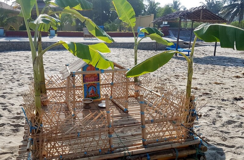 Частью нашего недавнего путешествия по Мьянме был пляжный отдых 10 дней комфорта на пустынном пляже Бенгальского залива за 40 тысяч на двоих с морепродуктами и ромом Изрядно уставшие после долгой дороги, прибыв в Нгве саунг и разместившись в отеле, мы сразу отправились на пляж. Там наше внимание привлекло странное сооружение Бамбуковый плот с "домиком" для Будды, украшенный банановыми листьями. Несколько дней мы наблюдали как по утрам сотрудники отеля "подкармливали" Будду, ставя подношения в домике И украшая плот все новыми и новыми блестяшками и побрякушками Однажды на закате, возвращаясь с прогулки по берегу, заметила, что плот переместился к воде и возле него наблюдается необычная активность. И в "домике" Будды появились щедрые дары - 3 блюда со свежими фруктами Собрался почти весь персонал отеля, включая его хозяйку. А к берегу подплывает баркас, с которого сбросили трос. Этот трос тут же подхватили 2 ребят, работающих в отеле. А остальные подняли плот и понесли его в море, закре