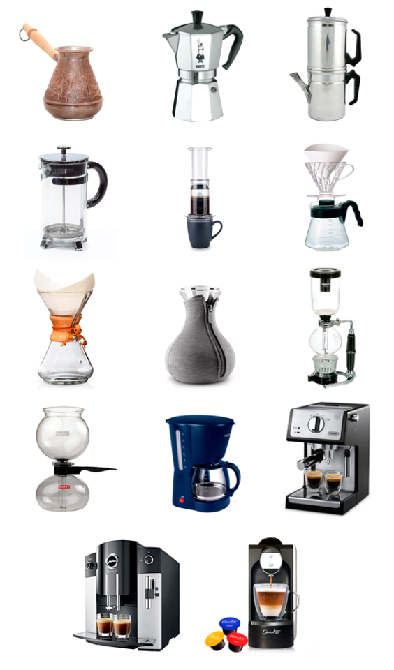 Сколько вы знаете способов заваривания кофе? Только честно. Я вам немножко подскажу, вот картинка. Я постаралась собрать все, кроме уж совсем экзотических вариантов. И да, растворимый в чашке не считается.