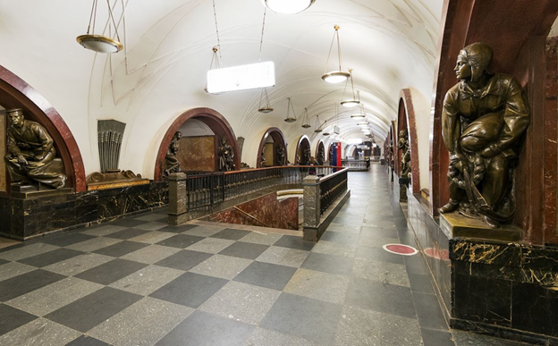Главная необычность станции это 76 бронзовых скульптур вобравших в себя историю нашего государства за 20 предвоенных лет.