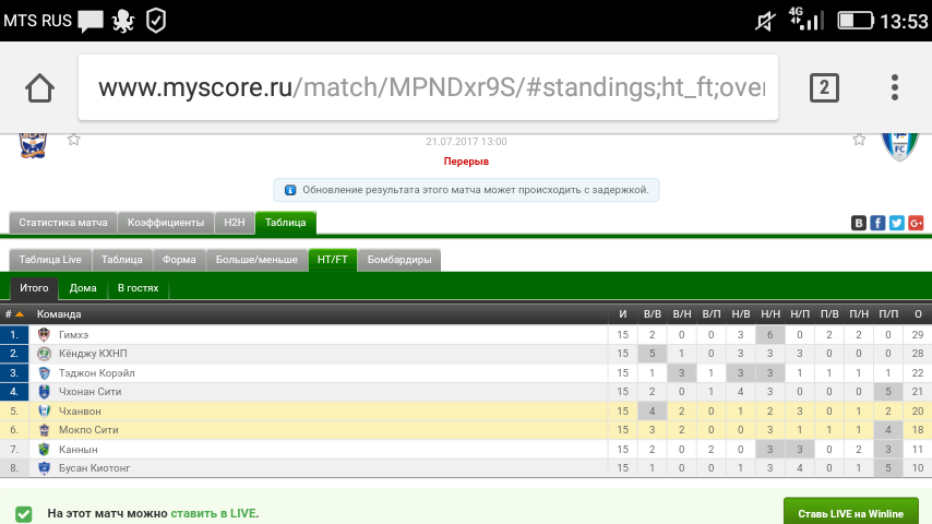 Здравствуйте, уважаемые читатели! Данная статья будет интересна людям, которые занимаются ставками. Сразу оговорюсь- на свежесть идеи не претендую, может где-то кто-то ранее предлагал нечто похожее. А мысль следующая. На полной версии сайта myscore в каждом футбольном матче есть владка "HT/FT", которая показывает, как команда играет первый тайм и матч в целом. Это я к чему: на мой взгляд, опираясь на данную информацию, можно делать выигрышные ставки на гол в первом тайме. Принцип следующий. В таблице есть колонки в/в, в/н, в/п, н/в, н/н, н/п, п/в, п/н, п/п. Нас будут интересовать все столбцы в/*, которые показывают, в скольких матчах команда выиграла первый тайм (а, соответственно, по логике, как минимум один гол в первом тайме был😎) и все столбцы п/*, которые показывают, в скольких матчах команда первый тайм проиграла, то есть пропускала как минимум один мяч. Если в столбцах н/* суммарно получается количество матчей 50 и более процентов, у обеих команд то, скорее всего, в первом т