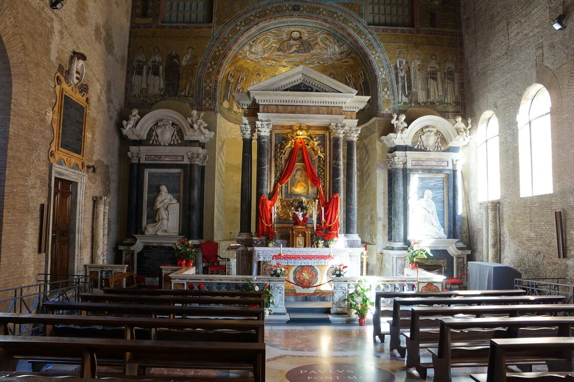 В Латеранском баптистерии находится молельня Сан-Венанцио, постройка которой восходит к понтификатам Иоанна IV (640-642). Центральной сценой всего цикла является Вознесение Христово, заслуживающее пристального внимания. Ораторий Сан-Венанцио, история Иоанн IV происходил из Далмации. Он послал аббата Мартино (впоследствии папу Мартина I) на свою родину, который привез оттуда в Рим мощи некоторых далматинских мучеников. Они до сих пор сохранились в молельне, посвященной Сан-Венанцио. Именно в этот период она была создана и украшена мозаикой, завершенной преемником Иоанна Феодором I. Мозаики Оратория Сан-Венанцио Мозаики, хранящиеся в Латеранском баптистерии представляют собой настоящий цикл. Они простираются над сводом апсиды и вдоль нее. Мозаики разделены на два отдельных раздела по тематике, а также по обстановке. Апсидальная арка в верхней части, которая включает в себя три окна, содержит четыре символа евангелистов и изображения городов Иерусалима и Вифлеема, представляющих Ветхий