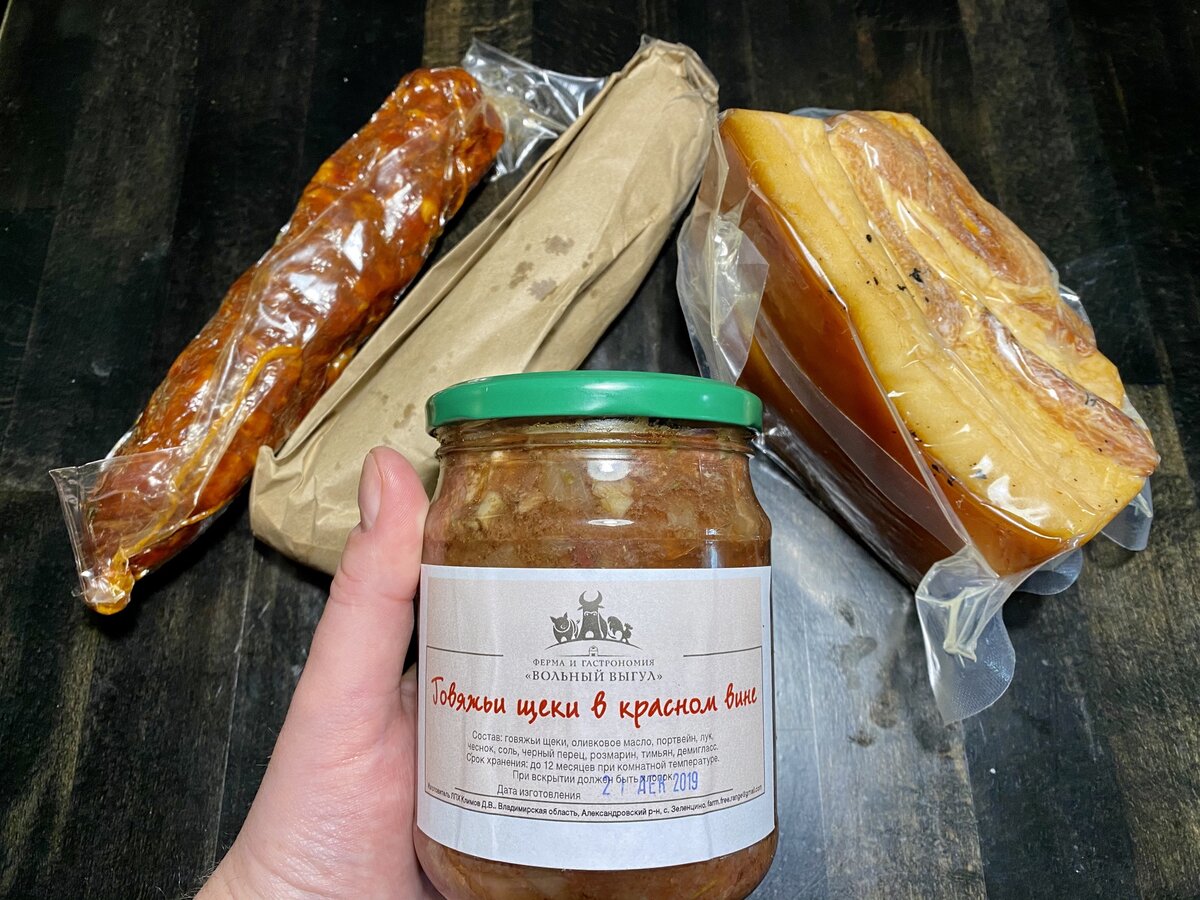 За этим набором продуктов я пошёл словно студент на опиатах, ищущий закладку: есть адрес, где я из рук фермера получу заветный пакет. Теперь давайте разбираться, дорого это или нет. Говяжьи щёки в красном вине — банка делится на два приёма и отлично заходит с гречкой. Спустя два месяца в камере созрела белая сыровяленая колбаса из свинины, в ней — лучший в мире перец из камбоджийской провинции Кампот. Этой палочки на 300 гр. слихвой хватит на пару недель. Остальные две недели утреннего кофе будет дополнять чорризо с тремя видами испанских паприк. Продолжает парад явств копчёная свиная корейка, автор и соучастник всех рецептов — Андрей Куспиц, знатный колбасник с пытливым умом. Ну и под занавес — общий прайс на эти деликатесы, которые прекрасно дополнят завтраки и ужины. Я напомню, что живу один и могу растянуть удовольствие от этого количества продуктов на месяц. А теперь важные для меня вопросы, как вы считаете: