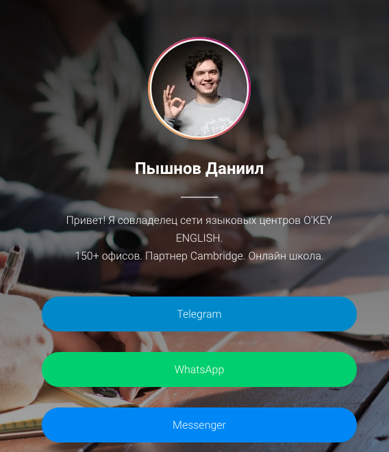 И я буду работать за тебя! Многие люди сегодня хотели бы услышать такую фразу - "Хочешь я буду за тебя работать, а ты будешь получать деньги?" Сидя в своем офисе, я придумал такую бизнес-модель. На сегодняшний день у меня более 150+ офисов и своя онлайн школа английского. Я готов предложить тебе стать соучредителем своего бизнеса. Твоя задача только в одном - становись популярней! Качай свой личный бренд! Так будет выглядеть твоя страница в Instagram! Интересно зачем? Тогда переходи на мой сайт okey.business и оставь там свой телефон - я перезвоню!