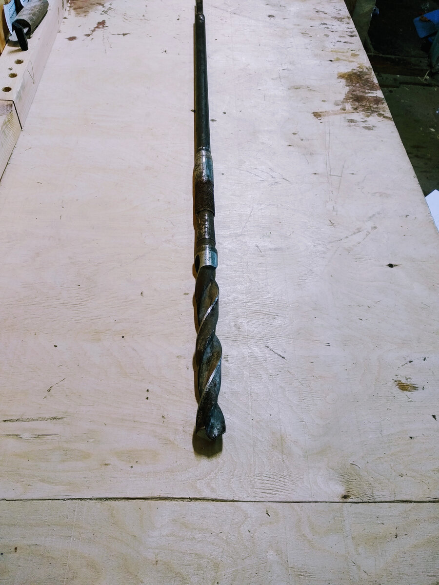 Была поставлена задача - провести отопление в подвал частого дома. Для этого, нужно сделать отверстия в деревянном полу для труб отопления. Но проблема в том, что пол в доме двойной( чистовой и черновой) и общая толщина его составляет под 900мм., чем его просверлить? Казалось бы, что ответ простой - идем в магазин, покупаем длинное винтовое сверло по дереву( 600мм.), удлинитель к нему( 300мм.) и спокойно сверлим. Но здесь есть два больших минуса. Во-первых, сверлить нужно в конкретном месте, и есть большая вероятность того, что при сверлении мы попадем на гвоздь, а для сверла по дереву это не очень хорошо. Во-вторых, покупать не дешевое удлиненное сверло ради двух отверстий не хочется. Будем делать бюджетное длинное сверло, которому нипочем любые гвозди. Было у меня старое сверло на 28 из Р6М5 с конусным хвостовиком и общей длиной 350мм. Для удлинения к нему был приварен 3/4 сгон длиной 120мм., затем труба с наружным диаметром 21мм. и в нее вставлен хвостовик на 16мм. Все детали бы