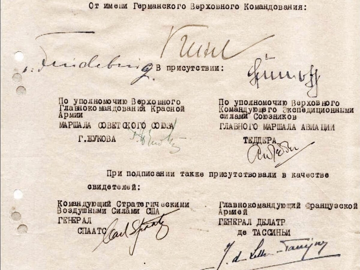 Капитуляцию приняли СССР и Англия, а США и Францию пригласили как свидетелей, на большее у них легитимности не хватило...