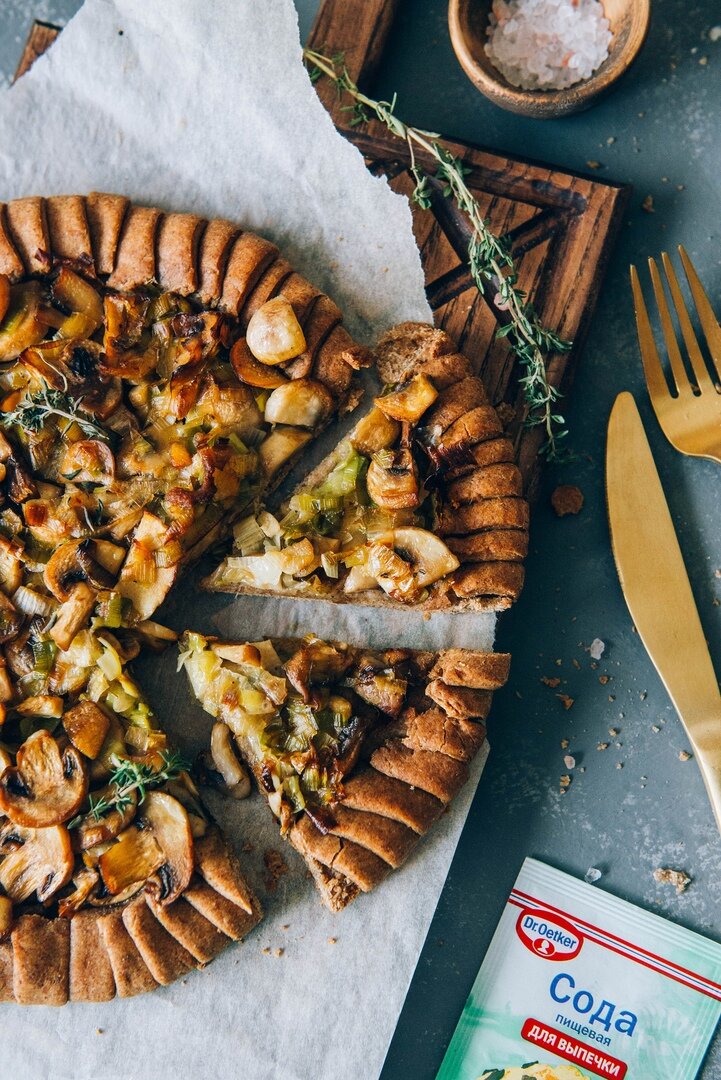 • Соль/перец - по вкусу 👉 Способ приготовления: ① В чаше смешиваем муку, сахар, щепотку соли и соду. Все перемешиваем. ② Отдельно соединяем воду и растительное масло. ③ Вливаем жидкие ингредиенты в сухие и замешиваем тесто (удобнее все делать в планетарном миксере насадкой крюк). ④ Из теста формируем шар, заворачиваем в пищевую пленку и оставляем на 30 минут. ⑤ Для начинки на сковороде на растительном масле обжариваем лук порей и чеснок. ⑥ Добавляем нарезанные пластинами шампин