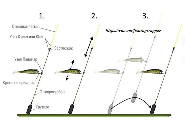 Дроп-шот и проводка: 1. устройство оснастки; 2. игра приманкой без отрыва груза; 3. ступенька или подброс.