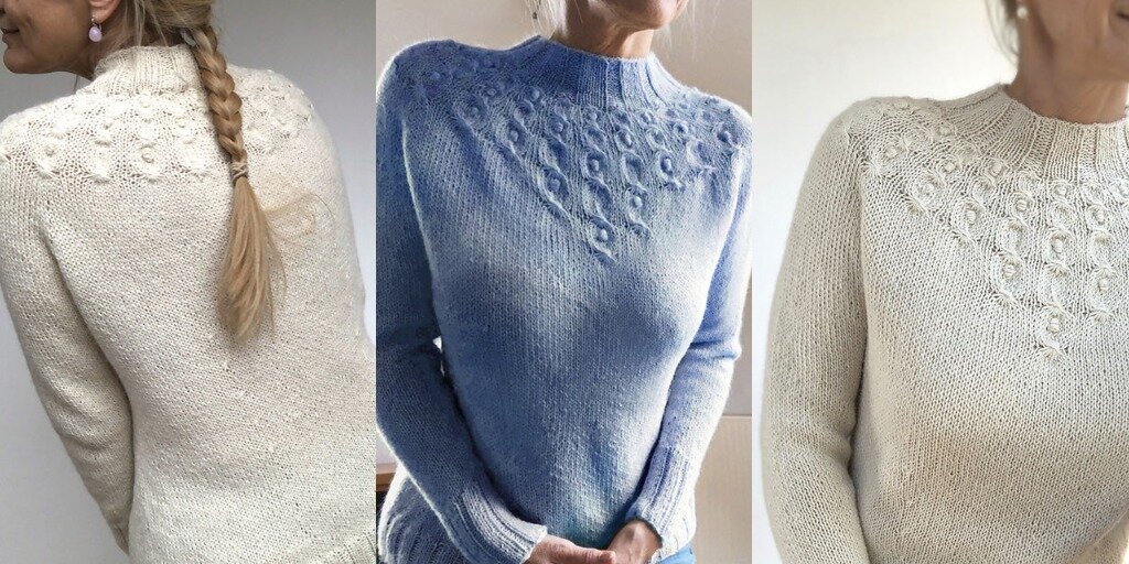 Модный и невероятно женственный свитер со своей изюминкой на круглой кокетке от дизайнера Ютты фон Хинтерм Штайн. Колье из стилизованных жемчужин в своей раковине окружают горловину и каскадом спускаются впереди, выгодно визуально вытягивая силуэт.