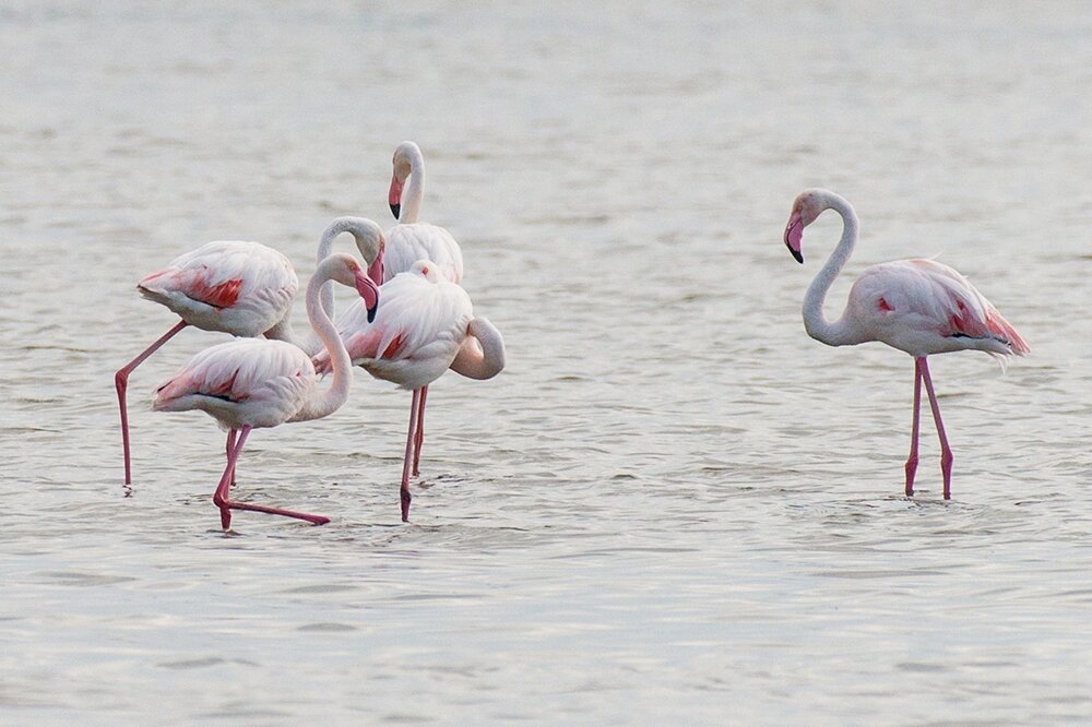 Наверное самой большой экзотикой для Крыма, несмотря на то, что с каждым годом этих птиц можно встретить всё чаще и чаще, остаются Фламинго. Обычно их видели по две-три птицы, но нам лично удалось увидеть небольшую стаю аж из 12 штук. Основным местом где они зимуют практически каждый год, это озеро Аджиголь под Феодосией. Но в этом году, пара молодых фламинго появилась даже в Севастопольской Солёной бухте. Фламинго очень доверчивые птицы, чем пользуются фотографы, раздражая их своей настырностью и желанием получить интересные кадры.