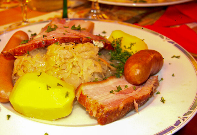 Шукрут (квашенная капуста со свининой и сосисками)(6-8 порций) 300 г бекона с прослойками жира 375 г копченой свиной лопатки 500-750 г соленой свиной брюшины (боковая часть) 1 свиная ножка, нарезанная ломтиками 6-8 франкфуртских сосисок 2 свиные сосиски из крупнозернистого фарша 2 луковицы 2 яблока 2 ст. л. свиного жира 1,5 кг квашеной капусты Ягоды можжевельника Горошины перца 0,25 л белого вина 6-8 картофелин Соль и свежемолотый перец Вымачивайте соленую свиную брюшину в холодной воде в течение нескольких часов., чтобы удалить избыток соли. Положите солонину в 1 л кипящей подсоленной воды, доведите до кипения и варите на медленном огне в течение 2 час. Очистите и нарежьте кубиками лук. Очистите яблоки, нарежьте их на четверти, затем тонкими ломтиками. Промойте под струей воды свиную ножку, обсушите ее, заправьте солью и перцем. Растопите свиной жир в большой кастрюле и последовательно выложите квашеную капусту, лук, нарезанные яблоки, нарезанную свиную ножку, ягоды можжевел