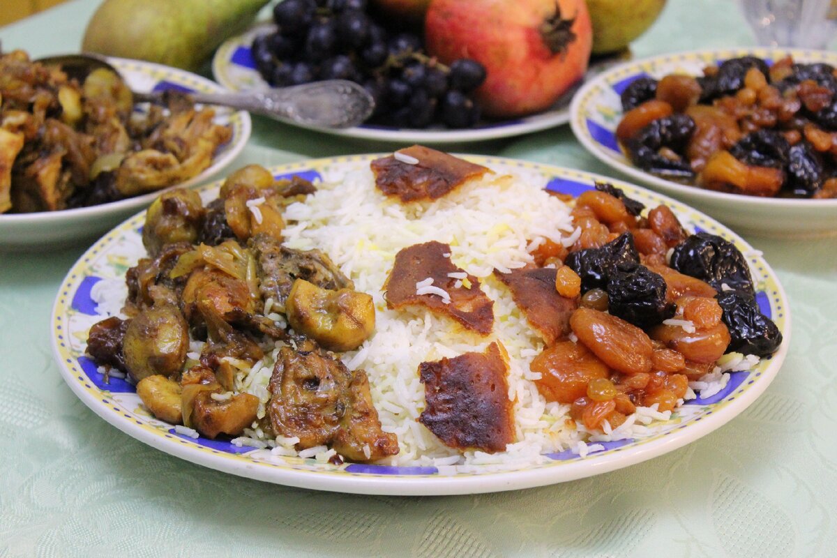 12. Подавать плов с ломтиками лепешки и мясом, присыпав сухофруктами.