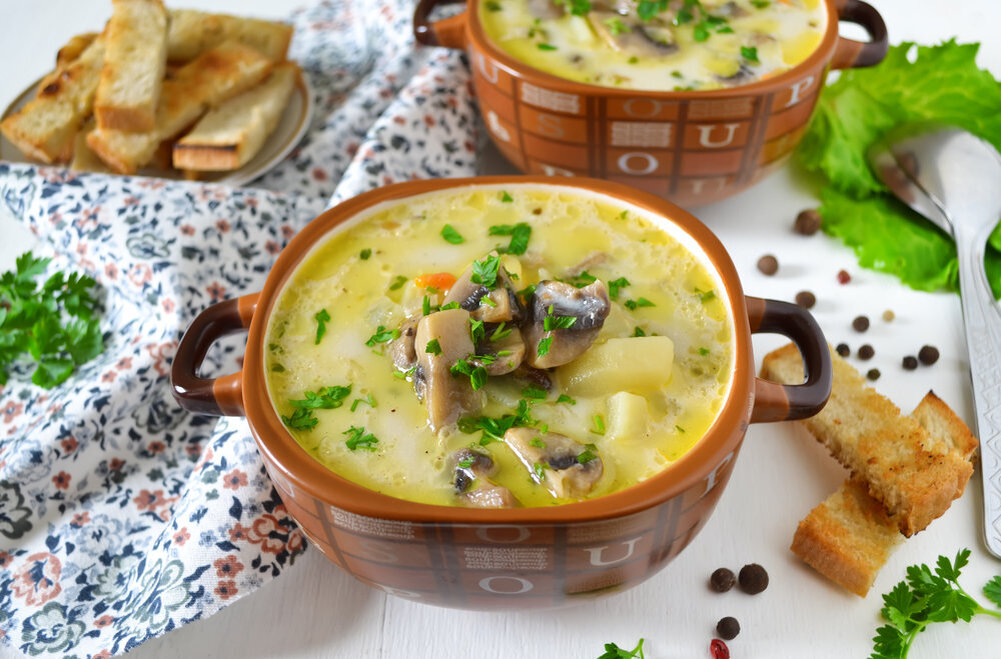 Ингредиенты: Лук репчатый - 1 головка Свежие шампиньоны - 500 г Картофель - 4-5 штук Куриная грудка - 500 г Растительное масло - 50 мл Вода - 1,5 л Плавленый сыр - 200 г Соль, перец по вкусу Инструкция приготовления: 1. Разогреваем сковороду, наливаем на нее немного растительного масла. Кладем мелко нарезанный лук, оставляем на пару минут. 2. Далее добавляем крупно нарезанные шампиньоны. Готовим 15–20 минут на медленном огне. Добавляем соль по вкусу. 3. В это время, наливаем в кастрюлю 1,5 литра воды и отвариваем курицу. 4. После того как курица сварилась добавляем нарезанный картофель. Варим 5 минут и добавляем сыр (лучше натереть на терке). 5. За пару минут до готовности картофеля добавляем грибы, варим еще пару минут. Суп готов.