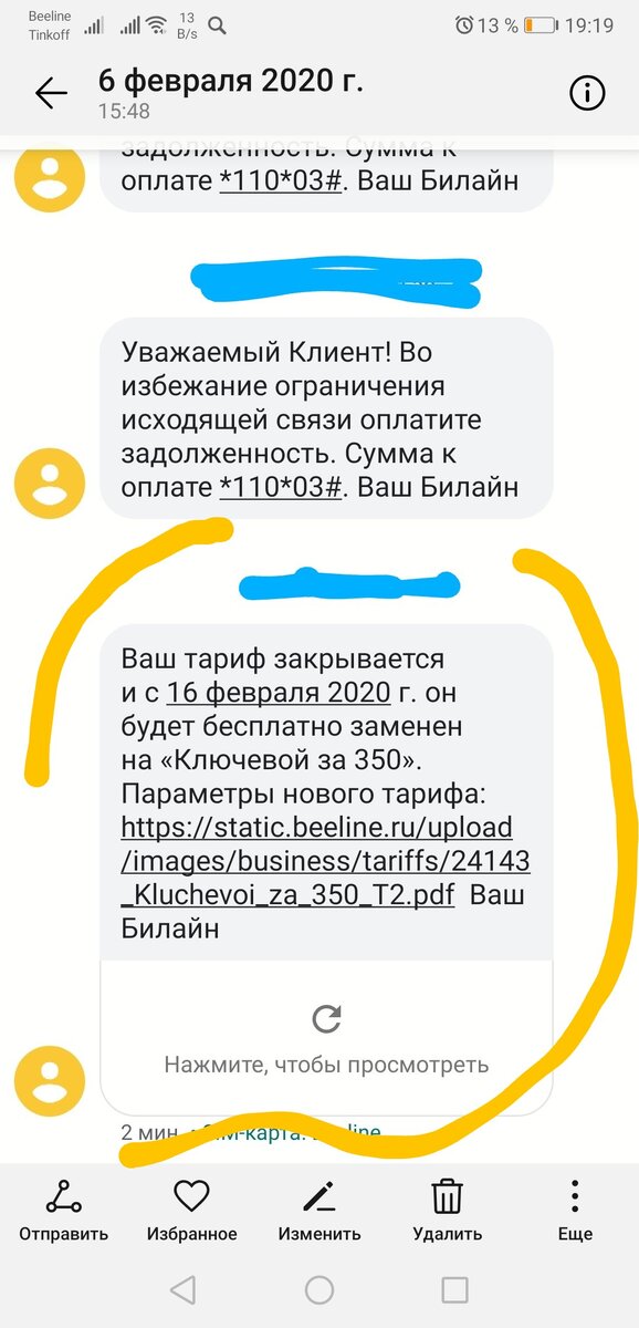 На тот момент, до изменения я имел в Билайне не самый плохой тариф, за 300 рублей в месяц у меня было 1000 минут, 15 ГБ и 1000 смс (для Красноярска это вполне выгодный пакет и по сей день). Этот тариф был корпоративный (бизнес), Билайн решил его ликвидировать и переподключить абонентов на более дорогие (и нафаршиванные) тарифы, о чём разослал смс.