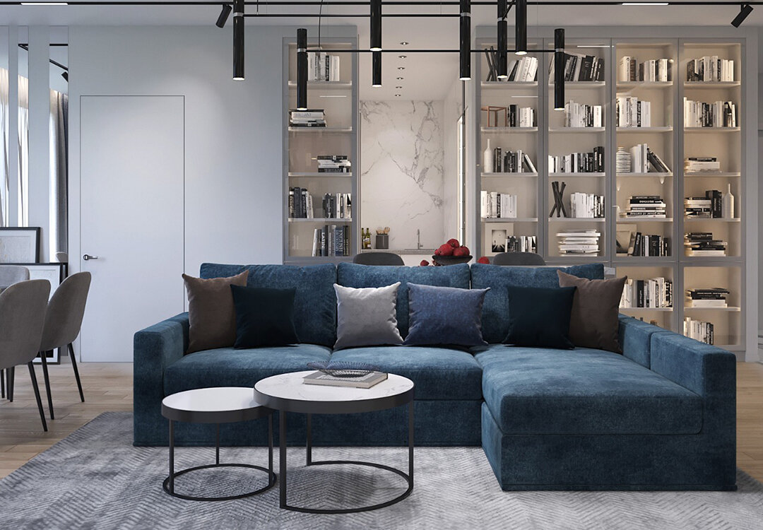 Его можно использовать в качестве акцента на фоне нейтральных и спокойных оттенков. Например, выкрасить стену в синий цвет, если все остальные светлые. Этот прием поможет визуально расширить пространство. Также для акцентирования синий можно использовать в мягкой мебели, текстиле и аксессуарах.