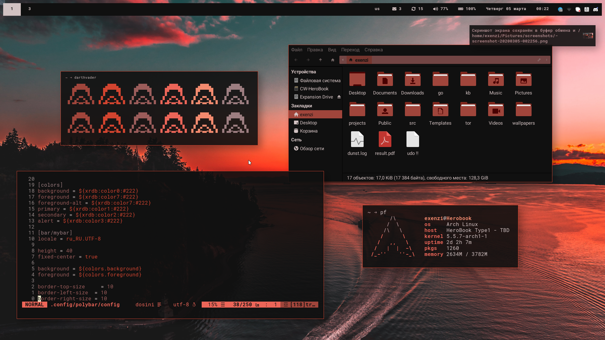 Однажды, насмотревшись красивых скриншотов с r/unixporn, я решил сделать свою тему оформления для рабочего стола i3 (Linux). Начал я конечно же с цветовой схемы... и тут же потерпел поражение. Оказалось, подобрать сочетающиеся цвета не так-то просто, если ничего не понимаешь в колористике. Но на помощь мне пришла прекрасная утилита под названием Pywal. В чём суть Pywal: программа берёт изображение, ставит его на рабочий стол, и на его основе генерирует цветовую схему, попутно применяя её ко всем программам, с которыми умеет работать. Открываем терминал, пишем wal -i путь/к/изображению и вуаля! Что может раскрасить pywal? Да всё, что угодно. Правда, к сожалению, для некоторых методов, которые не продуманы разработчиком, придётся доустановить дополнительный софт, написать простенький скрипт или поковыряться в конфигах. Pywal может автоматически перекрашивать многие эмуляторы терминала (urxvt, kitty), разные оконные менеджеры (i3/bspwm), панели (polybar, lemonbar), лоунчеры (dmenu, rofi),