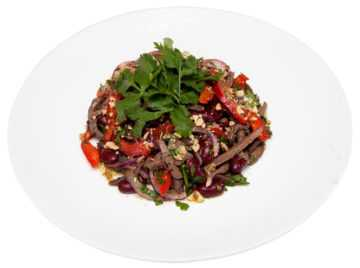 Это вкусный сытный салат можно приготовить из отварной говядины и фасоли. Рецепт такого салата будет вполне уместен и вечером, когда вся семья собирается на ужин, и в праздничный день, когда в гости приходит большая компания друзей. Фасоль для салата может быть красной консервированной или зелёной спаржевой. Кроме основных компонентов этого салата, можно использовать самые разные овощи, зелень, орехи, сыр. Экспериментировать можно бесконечно, и каждый раз будет получаться новое питательное блюдо. Остроты добавит красный перец, большей насыщенности – предварительно обжаренный лук, особой пикантности – маринованные огурчики. Заправлять фасолевый салат с мясом можно, в зависимости от предпочтений, майонезом и горчицей или маслом. Продукты на салат фасоль, говядина: Способ приготовления: Промыть мясо, очистить ножом от пенок и жира, выложить в кипящую воду, которую нужно посолить. Отваривать филе около двух часов, затем остудить и порезать соломкой. Перец болгарский красного ц