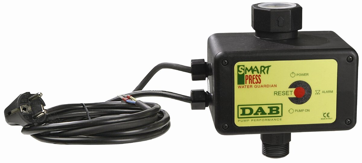 DAB Автоматический контроллер насоса SMART PREES - электронное устройство, разработанное для управления работой насоса в автоматическом режиме. Насос включается когда давление в системе меньше заданного значения (1,5 бар по умолчанию). Насос останавливается если нет существенного расхода воды или она отсутствует во всасывающем трубопроводе.