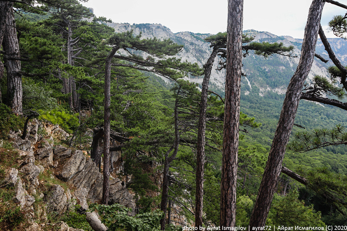 Это какой-то нереальный лес! Настоящие затерянные миры! Того и гляди, какие-нибудь фантастические твари взлетят :) Находится лес вблизи раскрученной достопримечательности - Серебряной Беседки. Той, что более 120 лет назад построена здесь в честь окончания строительства дороги из Бахчисарая в Ялту. Обычно к беседке и устремляется народ, доставленный сюда многочисленными автобусами и таксистами. Многие даже не замечают, какие виды открываются с соседних точек. Несомненно, вид из беседки тоже заслуживает внимания. Ялта внизу как на ладони. Вдали за гребнем горы притаился Аю-Даг. Меня же заинтересовали сосны на вершине и особенно на склоне горы Пендикюль. Завораживающие картины. Камни отшлифованы до блеска ногами туристов. Не знаю, кстати, почему крона сосен смещена в одну сторону. Как версия - преобладающая роза ветров влияет. Хотя может быть и какие-то аномалии. В общем, самое большое наслаждение я получил от лицезрения этих странных хвойных деревьев на обрывистых склонах и от процесса