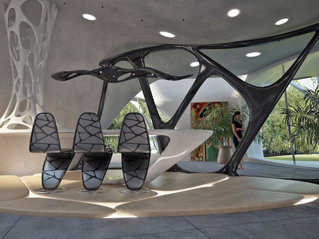 Не только внешняя форма, но и связанное с ней «содержание» напоминают о связи с природой. Сферическая постройка внутри предстанет как серия пещер-промоин в мягкой породе, стеклянный призматический стол продемонстрирует ячеистость внутренних отсеков, поверхность кресла из термопластика явит пористую структуру материала.