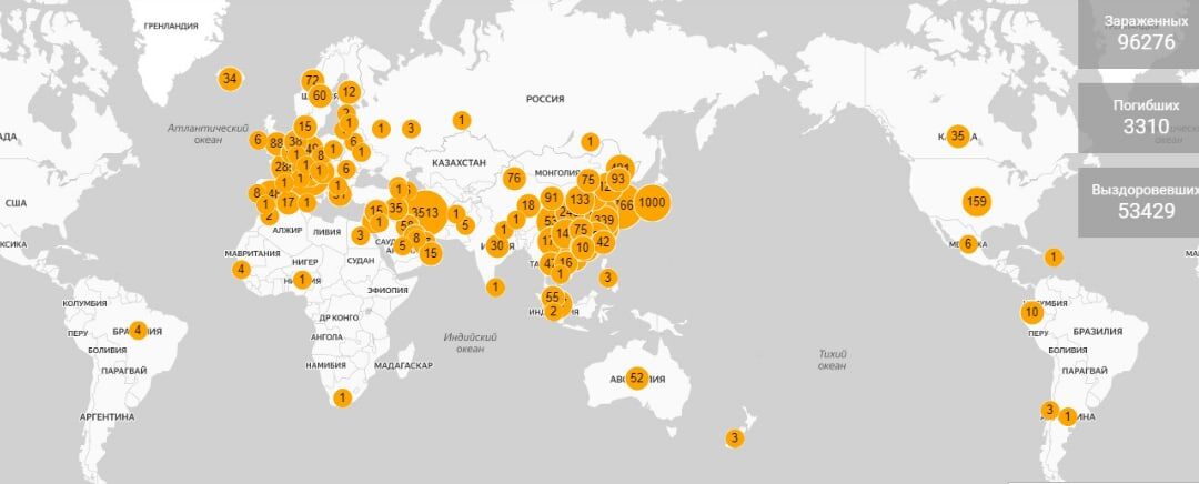 Зараженных:96276 Погибших:3310 Выздоровевших:53429 6 случаев заражения в России