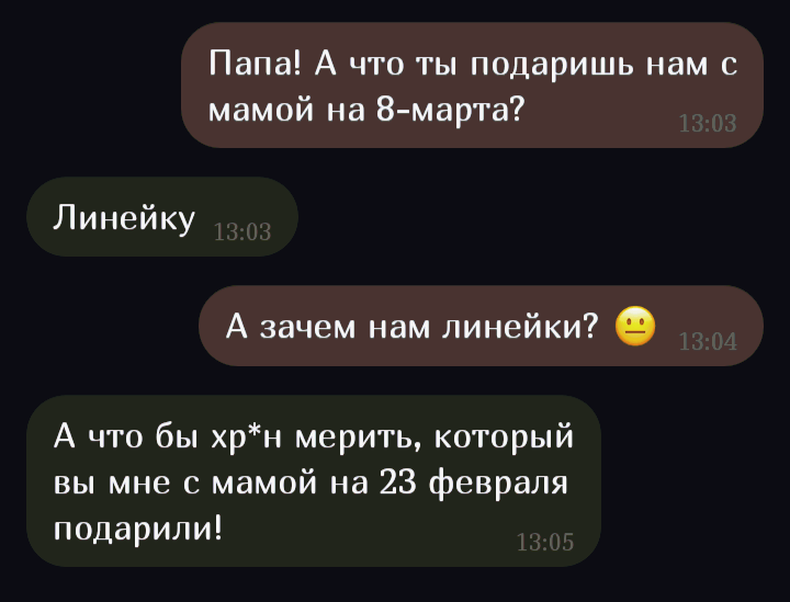 Привет всем!!! У нас тут переписка к 8 марта подъехала, ловите: Линейка это самое оптимальное, измеряйте пожалуйста. Да брось ты эту посуду, сегодня твой день, отдыхай!!! Тут и я не сразу понял прикола. Всех женщин с наступающим праздником, оставайтесь всегда красивыми, мы вас любим. Всем добра, удачи!!!