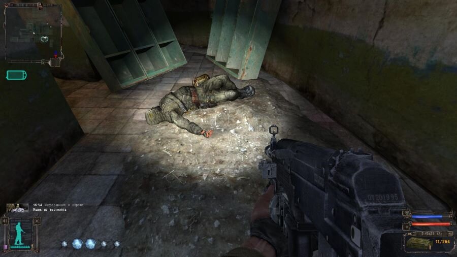 Лаборатория х18-это первая лаборатория которая попадается нам в игре. Попадая туда мы встречаем новых монстров: снорки, полтергейсты, псевдогигант. Также эта лаборатория не обделена довольно хорошими схронами, которые заготовили разработчики для самых внимательных игроков. Вооружаемся защитой от монстров и погнали. Попадая в лабораторию не спишите сразу бежать вниз. За лифтом лежит труп у которого всегда что-нибудь есть ; Спустившись к первой кодовой двери, идем в первую комнату слева от этой двери. В углу бассейна с «холодцом» лежит еле заметный артефакт. А в левом углу этой же комнаты за опасной колбой лежат антирады; Выйдя опять в зал с кодовой дверью идем в показанную на картинке комнату. Там мы видим металлические шкафчики, проверяем все и находим первый комбез монолита. Так же там на полую лежит «кристалл»; Пройдя огненный тоннель и подойдя к месту где лежит труп ученого с нужным нам кодом. Заходим в соседнюю комнату там в раковине лежат антирады; Спустившись вниз,