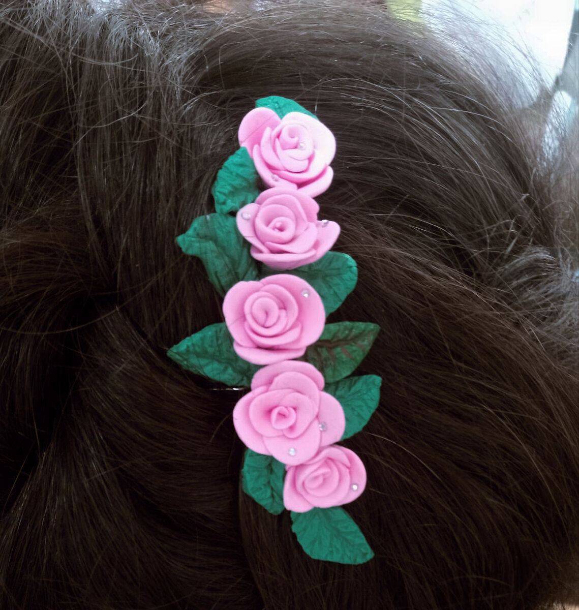 Здравствуйте дорогие друзья, сегодня я хочу рассказать вам, как сделать подобный описанию ниже гребень. Для начала нам понадобиться полимерная глина, гребешок или шпилька. Берём глину и раскатываем в тонкий пласт, после чего мы скатываем этот пласт в тонкую трубочку. И делаем лепестки как показано фотографиями ниже. Вот что у нас должно получиться в итоге. Дальше мы делаем листочки к нашим розочкам. Вырезаем из глины приблизительную форму наших листочков, и делаем надрезы. Наши розочки и листочки готовы, запекаем. Время и температура выпекания указана на упаковке глины. После запекания приклеиваем на прозрачный клей "Момент" к гребешку или шпильке. Вот что у вас должно получиться в конечном итоге.