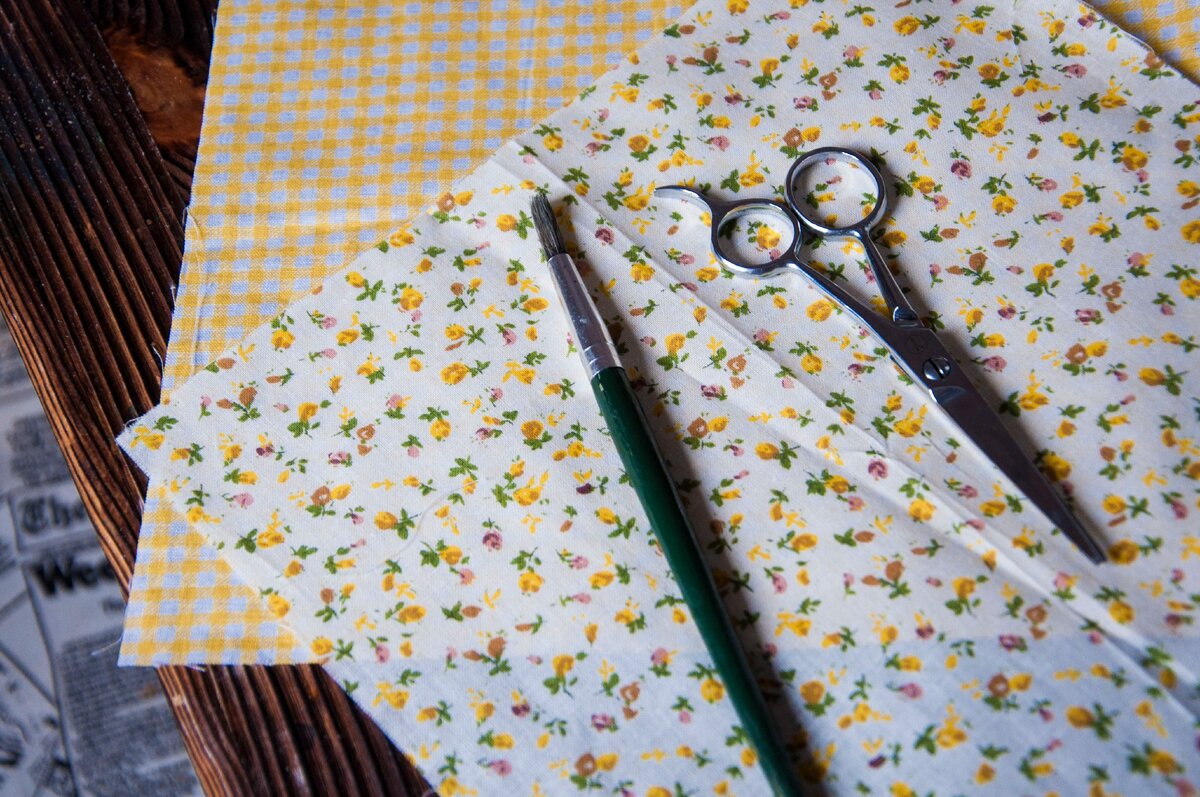 Итак, все как я люблю: минимум материалов и времени, максимум - пользы))) Обычная хлопковая ткань в мелкий рисунок, у меня лоскутки 25/25см, кисточка, ножницы,