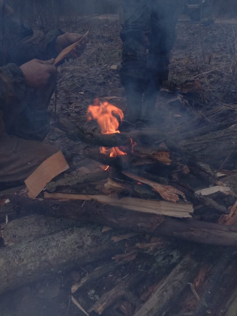 Мы развели костер прямо среди воронок, где указал проводник. Он притащил гору валежника почти в человеческий рост, когда огонь разгорелся, заставил нас свалить в жар штук двадцать шрапнельников. И стал ждать, глядя на буйство огня. В какой то момент, что то увидев пламени, он кивнул сам себе и сказал: