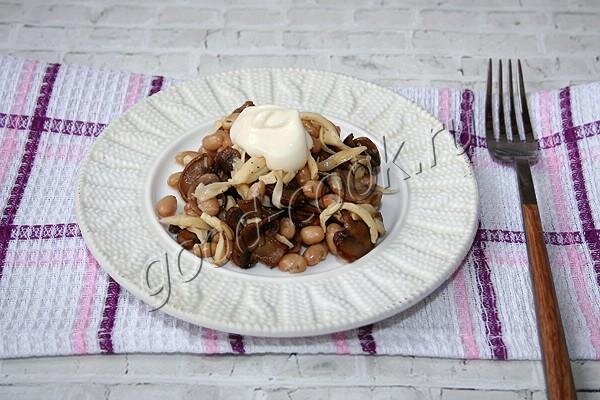 Вкус у салата сбалансирован - крахмалистая фасоль, сочные ароматные грибы и солоноватый сыр.