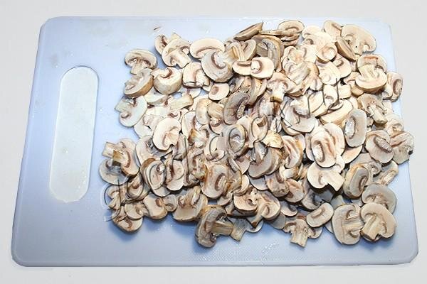 Шампиньоны вымыть и нарезать пластинками. В сковороде на большом огне разогреть растительное масло и выложить в неё грибы. Посолить и поперчить. Жарить при периодическом помешивании до зарумянивания. Не доводить до пережаривания и пересушивания грибов - пластинки должны зарумяниться, но остаться сочными. Снять сковороду с грибами с огня и оставить остывать.