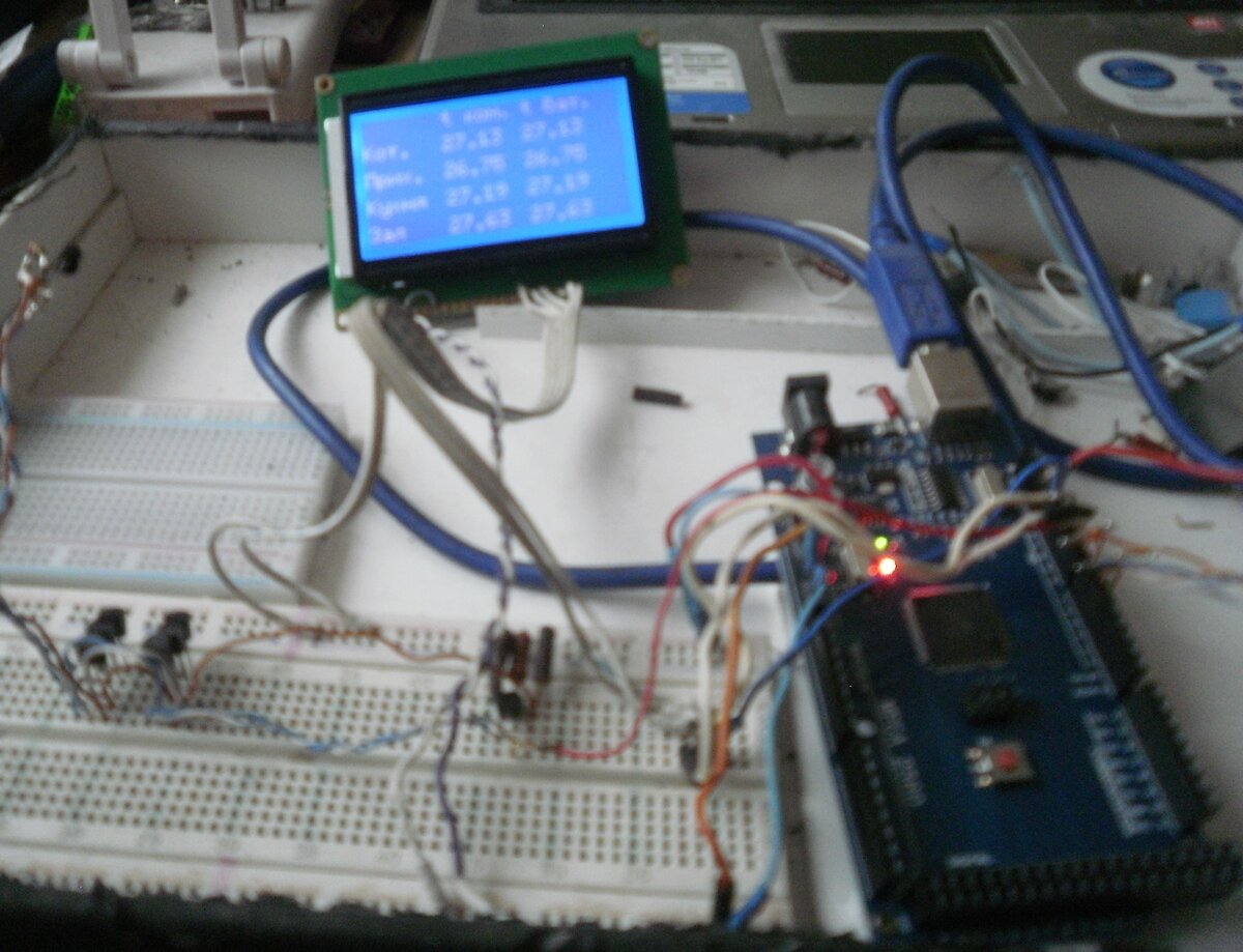 Проект плавно перерос с UNO на MEGA... Так как памяти UNO уже не хватало, при переходе 26 кб он начинал глючить, пришлось пересесть на MEGA. Вот такой он получился... Если охота по разбираться -рисунок полноформатный здесь. Я не большой сторонник украшательств и поэтому главный экран состоит из (пока) двух страниц. Они автоматически переключаются каждые 10 сек. Вход в настройки осуществляется отдельной кнопкой, автоматический режим возврата на главный экран делать не стал (буду, не буду, пока не решил). К сожалению пока eeprom не победил (может я просто не правильно готовлю его... надо наверное подсолнечное масло поменять на оливковое при жарке) поэтому уставка при перезагрузке теряется и становиться в первоначальное состояние. Уставку можно поменять только при нажатой кнопке "запись", в другом случае листает по комнатам. И ещё... массивы я немного победил... есть некоторые вопросы, но не существенные. И это чисто моё мнение... P.S. eeprom ПОБЕЖДЁН !!!! Вариант записи и чтения/вывод
