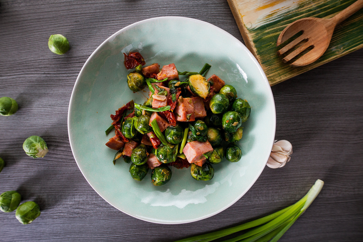 Ингредиенты: Ветчина 250г Брюссельская капуста б/ замороженная 350г Сливочное масло 20г Вяленые томаты 5 шт Чеснок 2 зубчика Зелёный лук 5г Соль Перец Приготовление: 🥓Сотейник поставить на нагрев, налить в него горячую воду и закинуть брюссельскую капусту. Подержать её в кипящей воде 2 — 3 минуты. 🥓Очистить и слайсами нарезать зубчики чеснока. 🥓Сковороду поставить на нагрев, выложить сливочное масло и нарезанный чеснок. 🥓Ветчину нарезать крупно, чтобы кусочки были примерно одного размера с капустой. 🥓Ветчину выложить на сковороду и обжарить вместе с чесноком. 🥓Нарезать вяленные томаты. 🥓Белую часть лука мелко нарезать, закинуть на сковороду к ветчине и обжарить. Оставшийся зелёный лук нарезать длинными перьями. 🥓Сотейник с капустой снять с огня, слить воду, капусту откинуть на дуршлаг. 🥓На сковороду выложить вяленные томаты и зелёный лук. 🥓Капусту посолить 1 щепоткой. 🥓Поперчить по вкусу овощи и ветчину. 🥓Капусту выложить на сковороду, обжарить в течение 15 секунд и снять с