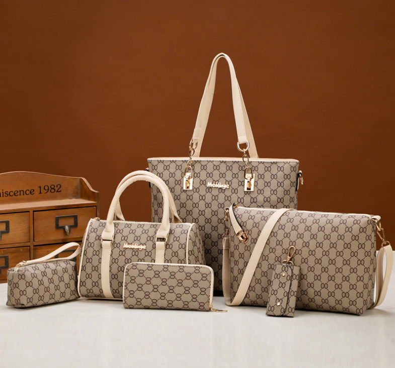 Комплект включает в себя: большую сумку шоппер. Сумочку среднего размера на плечо. Повседневную сумочку среднего размера с двумя ручками. Сумку-косметичку. Большой бумажник. И небольшой кошелек-ключницу.