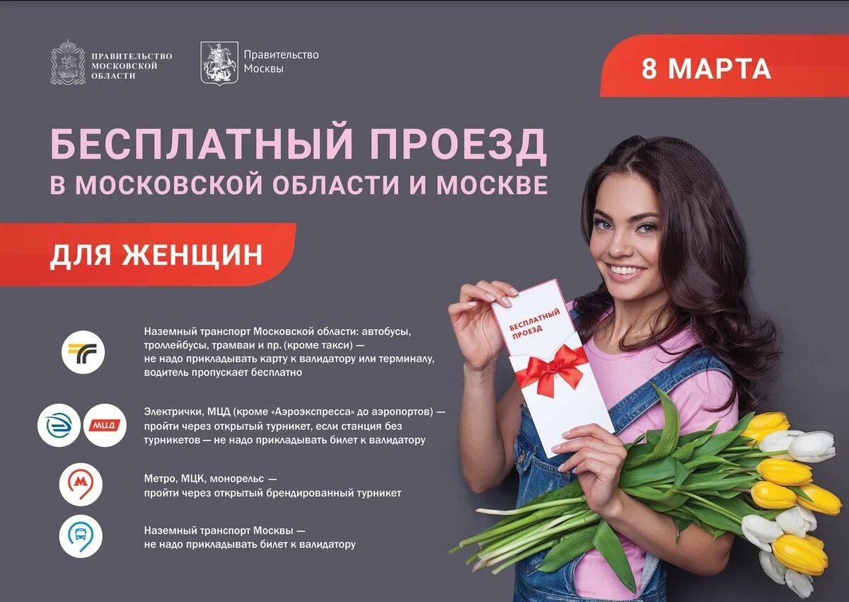 В Международный женский день проезд для женщин в Москве и Подмосковье будет бесплатным. Такой подарок решили сделать женщинам губернатор Московской области Андрей Воробьев и мэр Москвы Сергей Собянин.