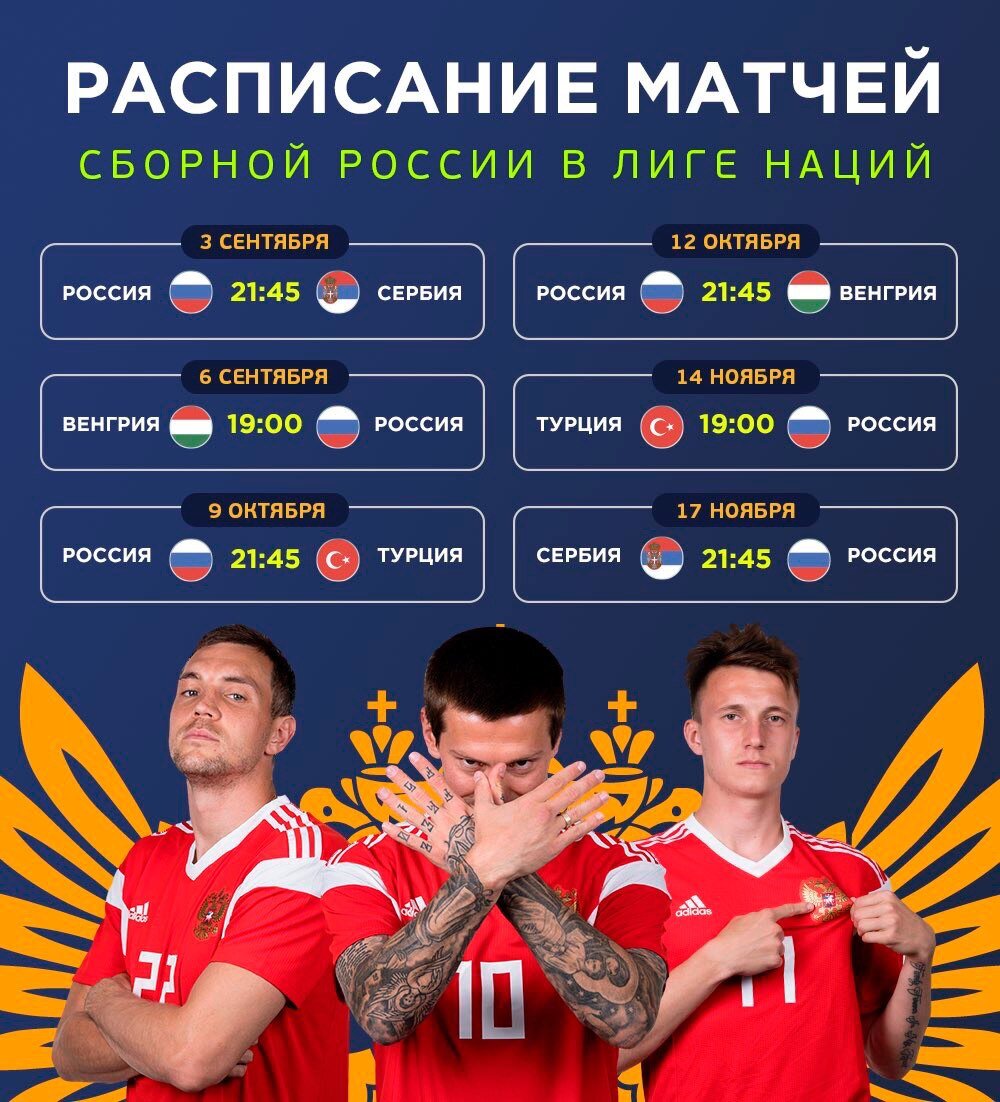 Известно расписание матчей сборной России в Лиге Наций. Команда Станислава Черчесова попала в группу с Сербией, Венгрией и Турцией. Раписание матчей: 3 сентября Россия – Сербия (21:45) 6 сентября Венгрия – Россия (19:00) 9 октября Россия – Турция (21:45) 12 октября Россия – Венгрия (21:45) 14 ноября Турция – Россия (19:00) 17 ноября Сербия – Россия (21:45) Комментарий главного тренера сборной России по футболу Станислава Черчесова: Жребий как жребий. Со сборной Турции мы часто играем в последнее время, они нам попались и в прошлый раз. С Венгрией играли пару лет назад перед Кубком конфедераций. Они тоже чуть по-другому стали играть. Нам не привыкать. 6 марта мы встречаемся с Сербией в контрольном матче, это будет подготовка и к чемпионату Европы, и к Лиге наций. Какие цели и задачи? Перед Лигой наций у нас большой турнир, поэтому пока не думаем об этом. Чемпионат Европы закончится, и тогда будем концентрироваться на следующем турнире. Ничего конкретного не могу сказать. Лига наций –