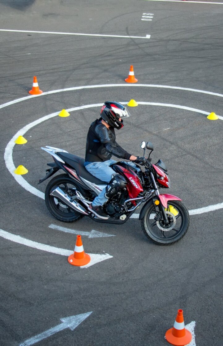 В практической части курсанты осваивают начальные навыки по управлению мотоциклами, а также элементы вождения на специализированной площадки для обучения вождению. Для этого используются простые и безопасные в управлении мотоциклы. Считается, что водить мотоцикл научиться легче, если умеешь ездить на велосипеде.
