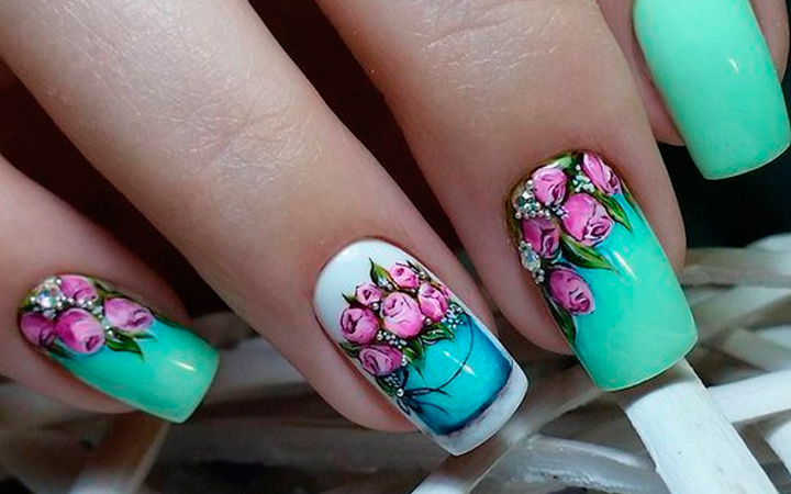 Мотивы с цветами - излюбленный вариант для нежных и романтичных натур, а также модниц, желающих соответствовать модным тенденциям. Изображения цветов на ногтях держаться на пике популярности уже не один сезон и набирают еще больше оборотов в весенний период. При этом нейл-арт с цветочками достаточно разноплановый и одновременно уникальный, перед ним вряд ли останется равнодушной хоть одна красавица. Полупрозрачный вариант Один из наиболее впечатляющих трендов этой весны - полупрозрачные, еле уловимые цветочки на ногтях. Создаются подобные рисунки акварельными или гель-красками в несколько слоев, с каждым из которых изображению придается больше глубины и выразительности. Однако эффектность подобного маникюра зависит в большей степени от опыта мастера. Также оригинальности дизайну можно придать изысканными стразами, добавленными в умеренном количестве. Флористические мотивы Помимо распустившихся бутонов, отличным решением для маникюра станут всевозможные листики и веточки. Среди таковых