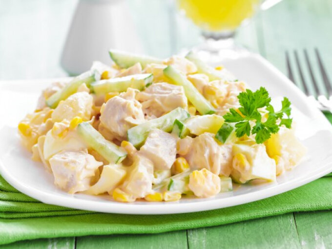 Простой, но мега вкусный салатик из курицы с кукурузой и огурцами