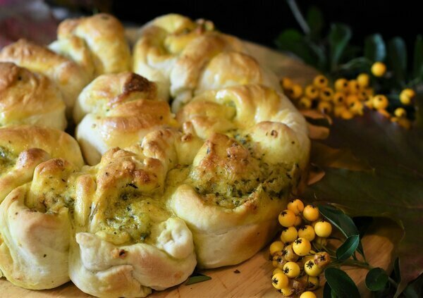 - Готовый хлеб украсить оставшимся песто и подавать.