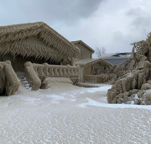 Жители штата Нью-Йорк (США), чьи дома находятся неподалёку от озера Эри, столкнулись с причудливым капризом погоды. В результате шторма их дома покрылись ледяной коркой и стали представлять собой нечто среднее между иглу и сказочными замками, как, например, в мультфильме «Холодное сердце». Несмотря на то, что со стороны такие постройки смотрятся даже красиво, домовладельцы пережили не самый приятный и даже пугающий опыт. Мало того, что лёд заблокировал окна и двери, внутри жилищ воцарилась темнота, которая никому не прибавила хорошего настроения.