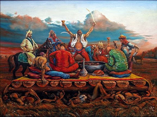 Битва на Калке — первое столкновение русских войск с монгольскими. Оно произошло за 12 лет до начала масштабного вторжения монголов на Русь. Русские князья сдались, поверив на слово монголам, что те не прольют их кровь. После сдачи в плен поверх князей положили доски и устроили «пир на костях». Создается впечатление, что монголы воплощение зла. К сожалению, историю пишет кто попало. Грустно, когда неполная информация попадает в школьные учебники. Читайте текст на картинке: Так в учебнике описали первую встречу монголов с русскими. Мстислав Удалой действительно убедил вступиться за половцев. Потому что об этом просил его тесть, половецкий хан Котян (готовый никнейм, берите на заметку). Битву при Калке русское войско с треском проиграло. В противовес единому командованию монгольской армии, русские князья действовали кто во что горазд. У каждого была своя дружина и каждый стремился заслужить славу в бою. Это привело к колоссальным потерям. По иронии судьбы, зачинщик и главный задира Мсти
