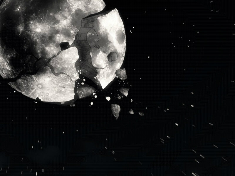 Неожиданно, его внимание привлекло отражении луны. Когда он очнулся, то взглядом охватил часть небосвода, в которой спутник отсутствовал. Обернувшись назад и подняв свой взгляд на ночное небо, парень увидел цепь больших осколков и две больших половины от когда-то существовавшей луны.